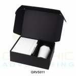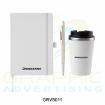 Gift set containing a double walled leakproof tumbler (350ml), A5 soft touch hardcover notebook and hexagonal barrel ballpoint pen – all 3 items are color matched in the gift set. Great value gift set from Giftology. Packed in a cardboard paper gift box.
